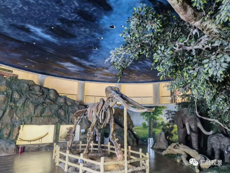 走進(jìn)古象化石展廳,在這里有一種回到了遠(yuǎn)古時(shí)代的感覺,光線比較暗,四周像森林,中間擺放的就是遷安特有的也是國內(nèi)特有亞洲罕見的古菱齒象骨架。