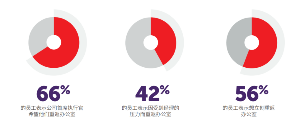 疫情長期延續,很多員工已感到居家辦公弊大于利。調研顯示,56%的受訪者渴望回歸辦公室,72%的受訪者已經開始回到辦公室工作,居家辦公時間在逐步減少。可見,員工已經主動調整工作與生活平衡。如果企業能夠創造更好的工作場景,員工會更傾向回到辦公室。