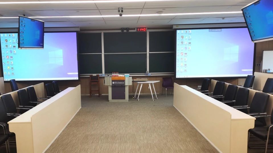 在錄播型教室共設置6塊可移動黑板、2塊150寸的投影大屏,教授在授課時不僅有充足的黑板空間進行書寫,還有可伸縮的投影大屏展示課件,讓所有學生都能夠看清屏幕內容,有利于老師和學生的交流和互動,為授課創造更豐富的靈動的教學空間。