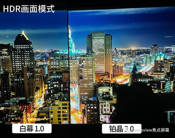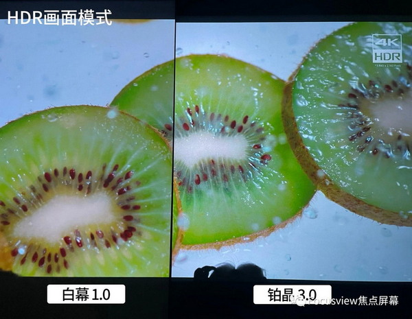 ▲HDR這項功能是可以大幅提升畫面的效果,在焦點鉑晶3.0增益幕布的加持下,我們能明顯看出HDR的畫面效果不管是從清晰度、對比度還是色彩還原上都明顯優于SDR,那么是不是只要投影機自帶HDR功能、播放了HDR的片源,無論什么屏幕都能夠對畫面做到很好的呈現呢?我們可以來做一個測試,用一塊標準的1.0增益白幕和 焦點3.0增益的鉑晶做一次對比:
