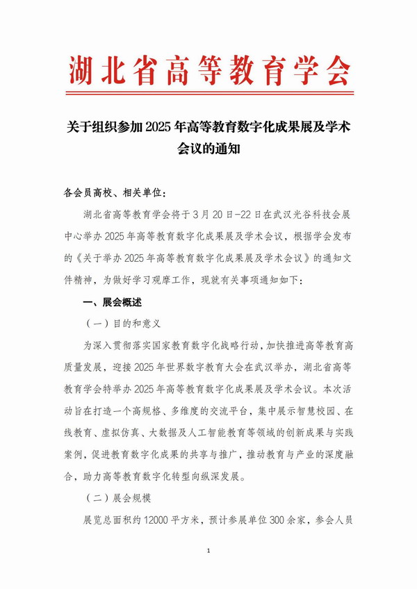 日前,湖北省高等教育學(xué)會下達(dá)《關(guān)于組織參加2025年高等教育數(shù)字化成果展及學(xué)術(shù)會議的通知》。
